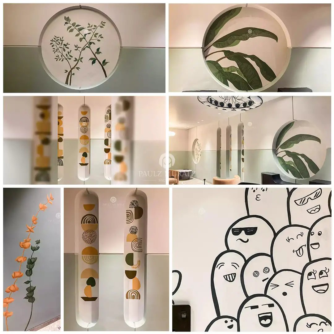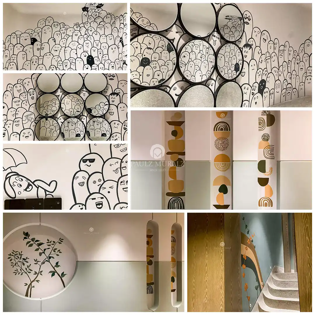 "This series of minimalist murals blends nature-inspired forms, playful patterns, and expressive characters to create a space that feels both modern and warm. With clean lines, earthy tones, and whimsical details, each artwork invites a sense of calm, joy, and connection, turning the walls into a subtle yet lively backdrop for conversation and creativity."
