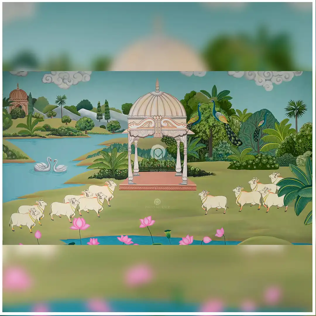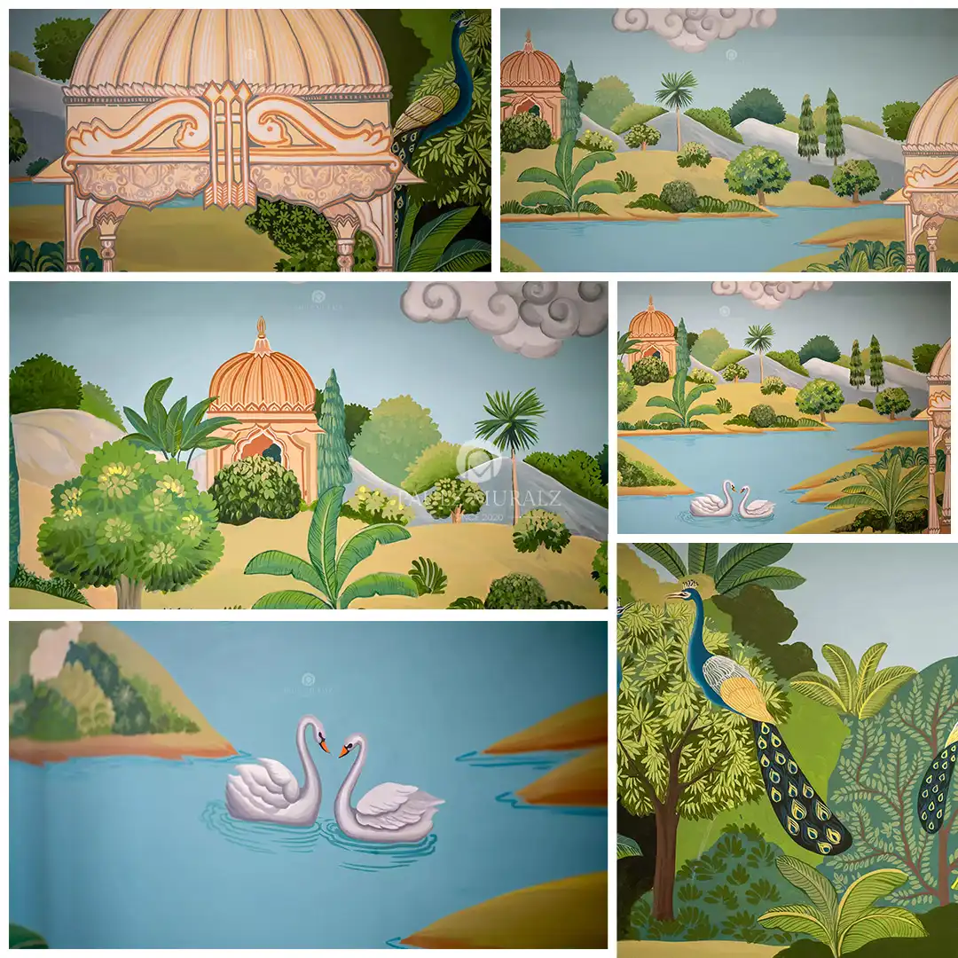 "This mural unfolds like a serene miniature painting, capturing the timeless beauty of nature and royal heritage. Domed pavilions rise gracefully amidst lush greenery, where peacocks display their splendor and swans glide over tranquil waters. With its soft colors, delicate details, and harmonious composition, the artwork evokes a peaceful escape into a world where art, nature, and tradition meet in perfect balance."