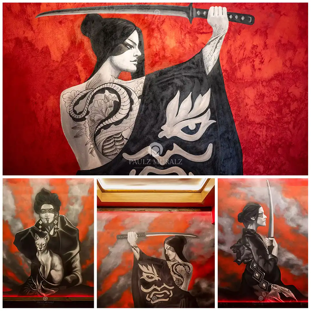 "Bold and electrifying, this mural commands attention with its striking fusion of Japanese warrior spirit and modern artistic flair. Set against a fiery red and smoky backdrop, the poised samurais and enigmatic central figure exude strength, mystery, and intensity. Perfectly embodying the restaurant’s daring and dynamic vibe, it invites guests into a space where culture, courage, and cuisine meet in unforgettable style."