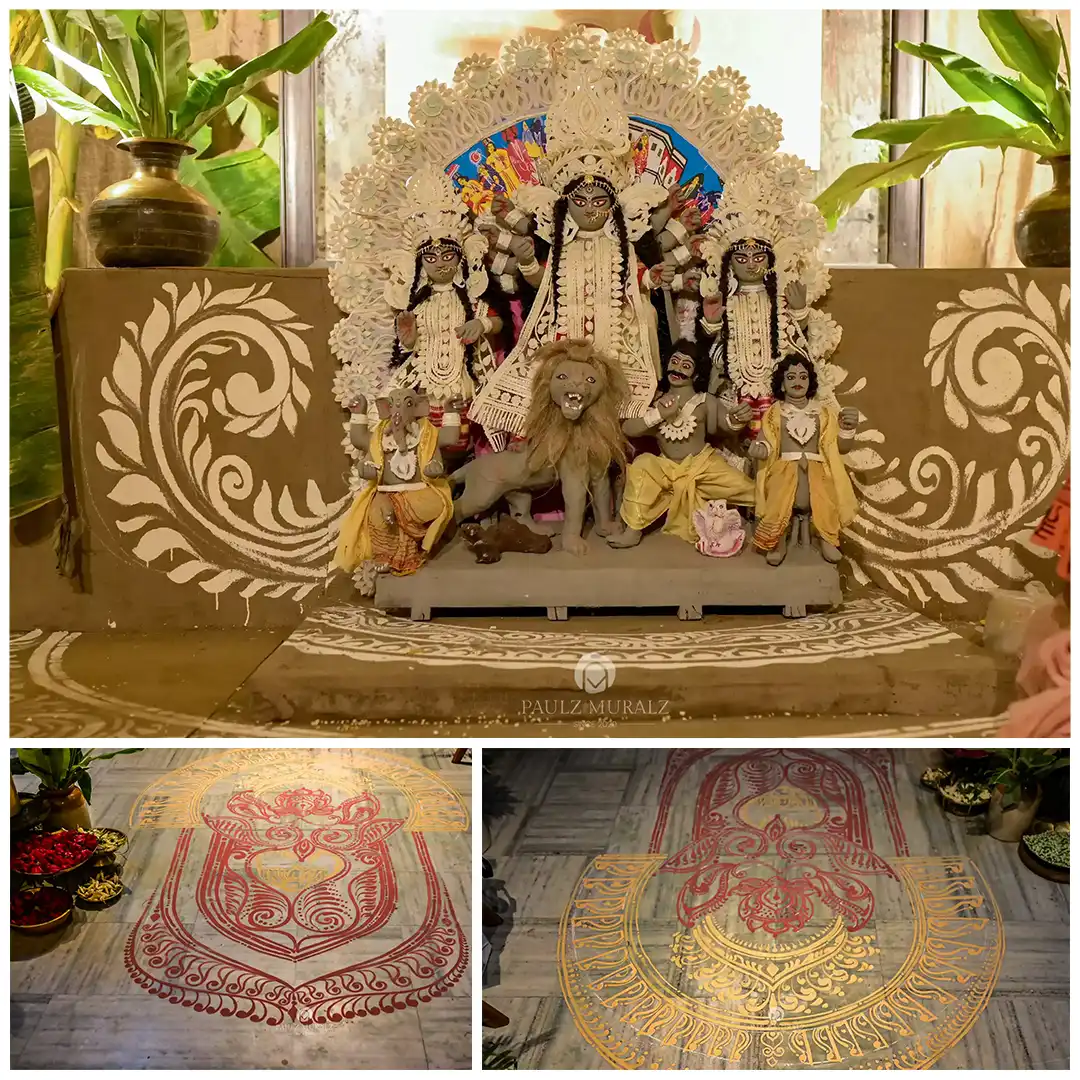 “This intricate alpona on the floor is more than just decoration – it is a symbol of devotion, tradition, and celebration. Each pattern is drawn to welcome Maa Durga and fill the space with divine energy, turning the puja pandal into a canvas of spirituality and festivity."