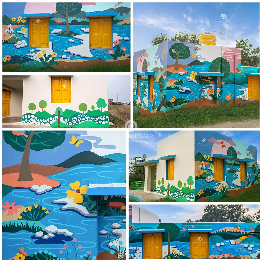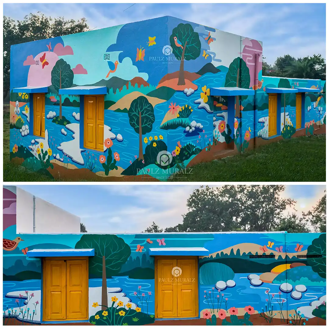"This mural beautifully blends nature’s harmony with bright imagination, depicting rivers, trees, flowers, birds, and butterflies in vibrant colors. It transforms the building into a lively landscape, evoking joy, peace, and connection with the environment while creating an inspiring and welcoming space for children."