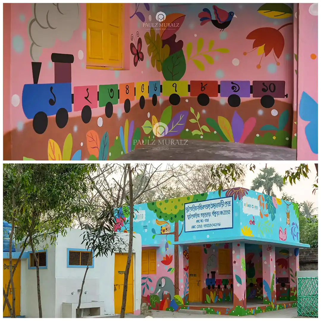 "This mural bursts with playful colors and cheerful characters, turning the building into a lively, welcoming space for children. With animals, flowers, and friendly figures, it creates an atmosphere of joy, imagination, and wonder—making learning feel like an exciting adventure."