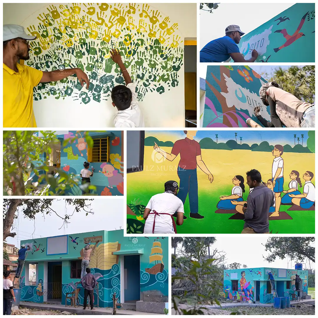 "This mural in progress captures the essence of rural life and nature, with artists painting vibrant rivers, fields, and human figures against a scenic backdrop. Each brushstroke adds life and storytelling to the walls, turning the space into a colorful celebration of culture, community, and environment."