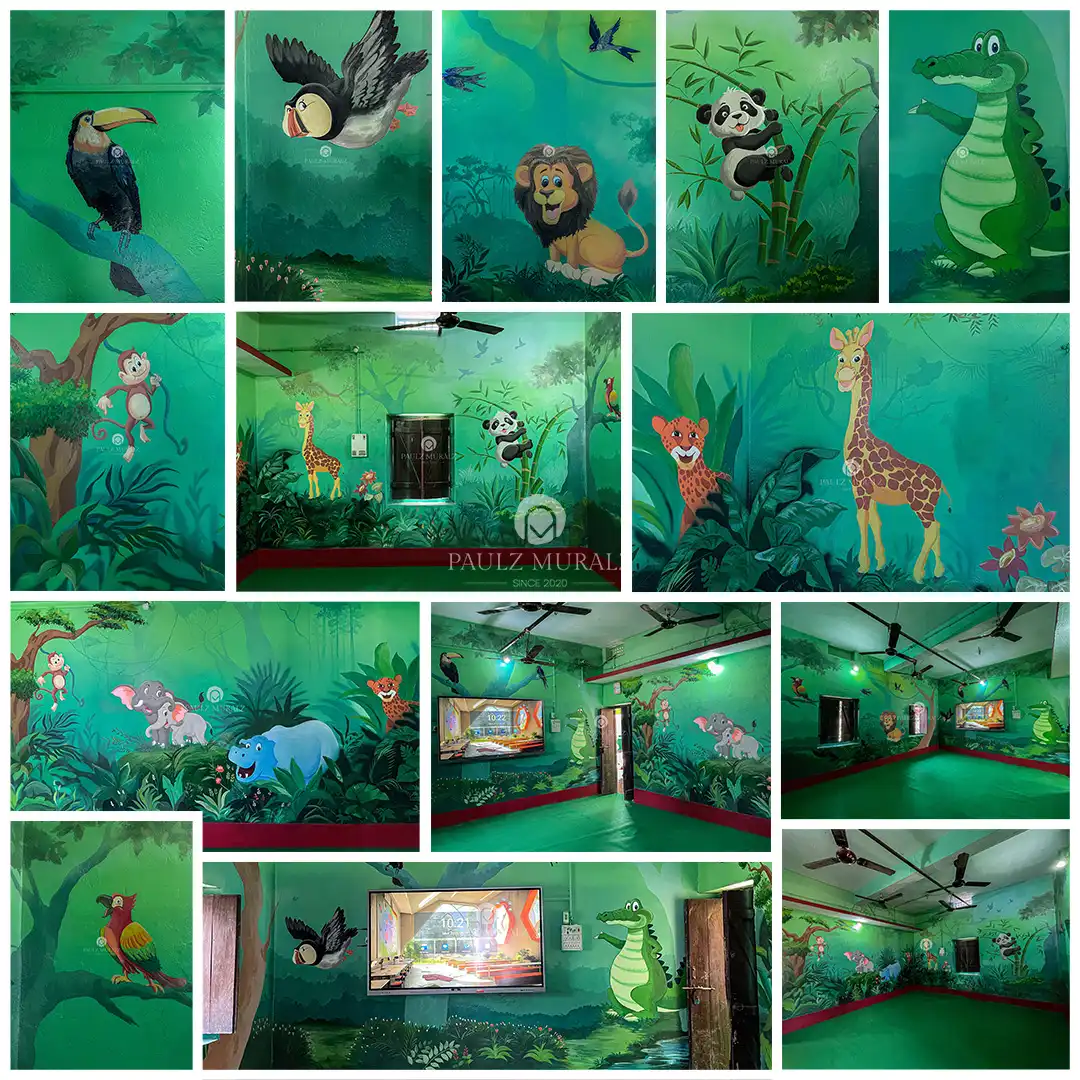 "This mural brings the wonders of nature to life, blending the vibrancy of a playful jungle with the mysteries of the deep ocean. From cheerful animals on land to majestic sea creatures underwater, it creates an immersive world of adventure and imagination, perfect for sparking joy and curiosity."