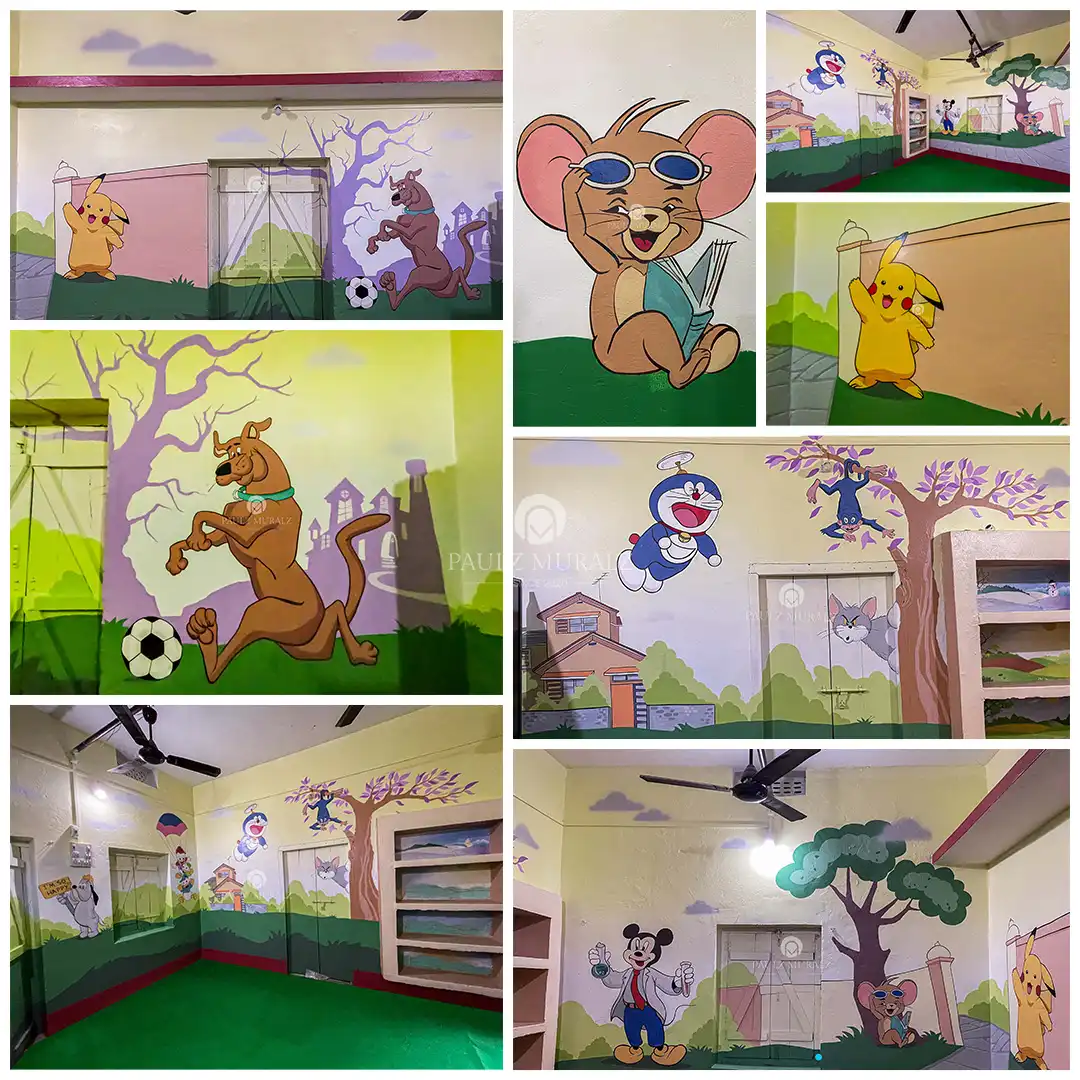 "This mural art transforms plain walls into engaging spaces of fun and learning. From playful cartoon characters that spark joy to educational diagrams that inspire curiosity, it creates a lively environment where imagination and knowledge come together in perfect harmony."