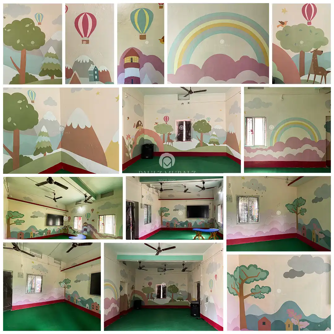 "This mural art creates a joyful world of imagination, filled with rainbows, hot air balloons, playful animals, and colorful landscapes. It transforms the space into a dreamlike setting where children can feel inspired, cheerful, and free to explore endless possibilities."