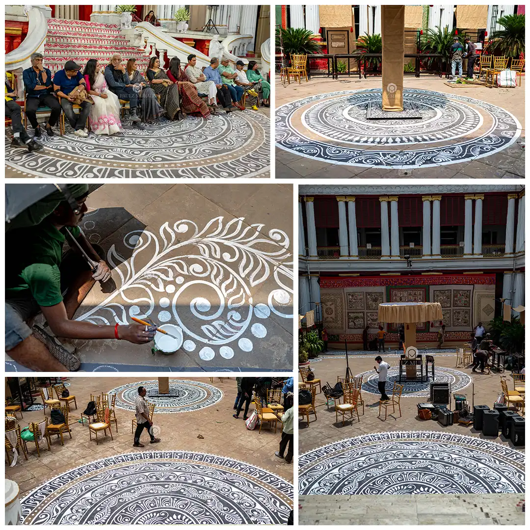 This Khelat Bhawan alpona features a striking circular composition drawn in crisp white against the stone courtyard, radiating balance and rhythm. Intricate folk motifs—flowing vines, paisley forms, and repetitive borders—unfold concentrically around the central pillar, creating a sense of sacred geometry and movement. Rooted in Bengali tradition yet bold in scale, the alpona beautifully transforms the historic space into a living canvas, blending ritual artistry with architectural grandeur.