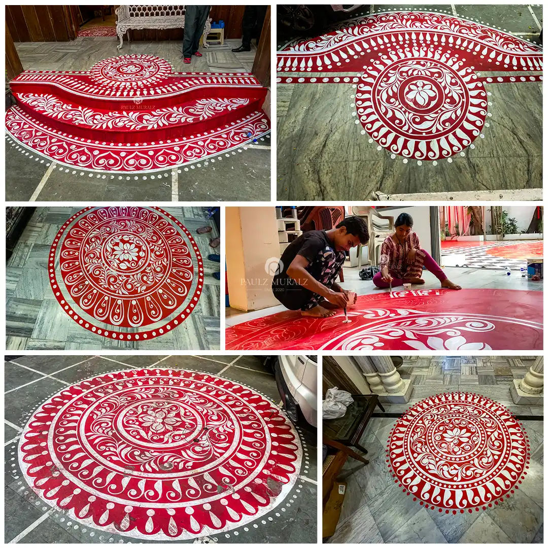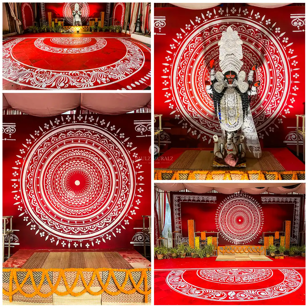 This Kapur Villa Kali Puja décor showcases a powerful harmony of ritual art and spatial design, dominated by an expansive red-and-white alpona that radiates from the sanctum. The intricate circular motifs frame the Kali idol with symbolic energy, creating a sacred axis between the floor, backdrop, and deity. The bold colour palette, precise symmetry, and handcrafted details together evoke devotion, grandeur, and the timeless essence of traditional Bengali Kali Puja.