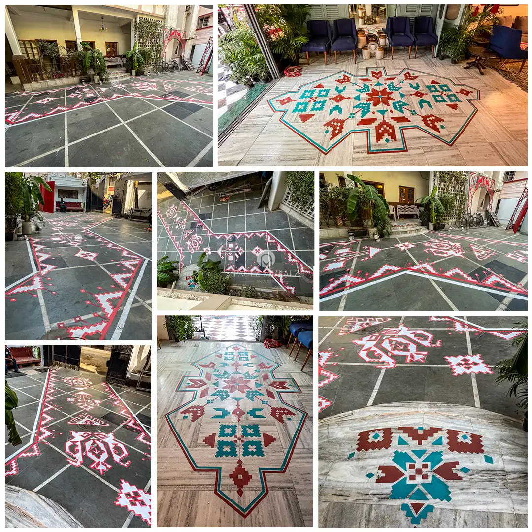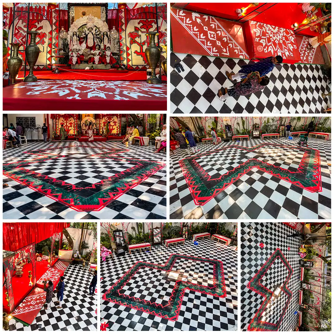 This Kapur Villa Durga Puja installation presents a striking fusion of traditional Bengali folk art and bold spatial geometry. The red-and-white alpona patterns extend from the sanctum onto a dramatic black-and-white checkered floor, guiding movement and framing the ritual space with symbolic precision. Paired with vibrant wall motifs and the richly adorned Durga idol, the design transforms the courtyard into a dynamic ceremonial landscape where devotion, design, and community come together.