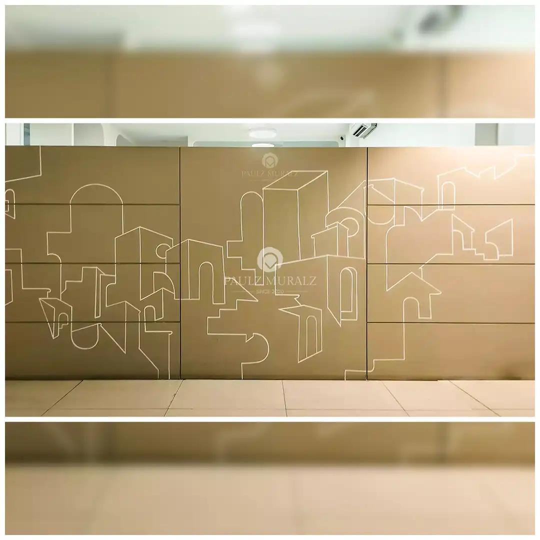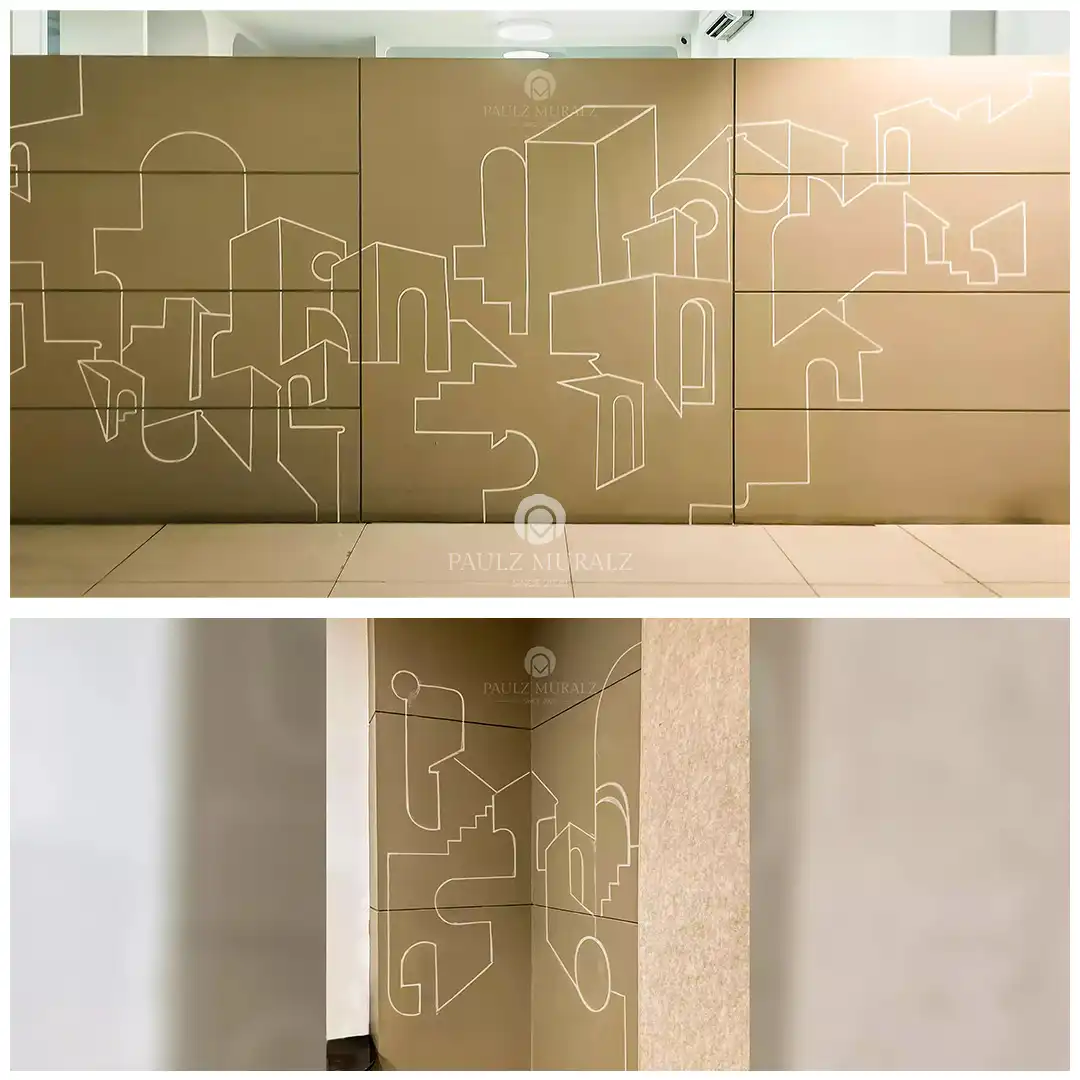 "This mural features a minimalist cityscape created with clean, white line art on a warm beige background."